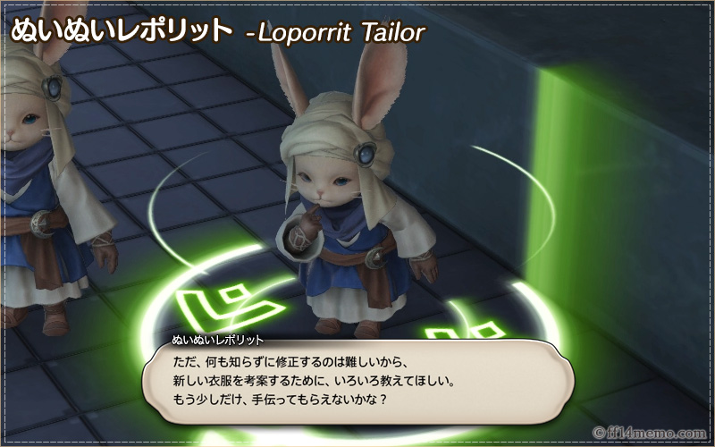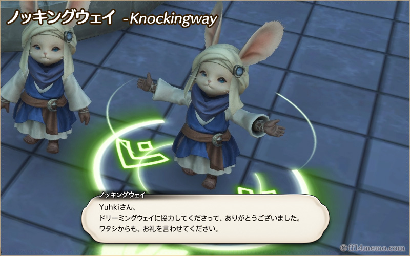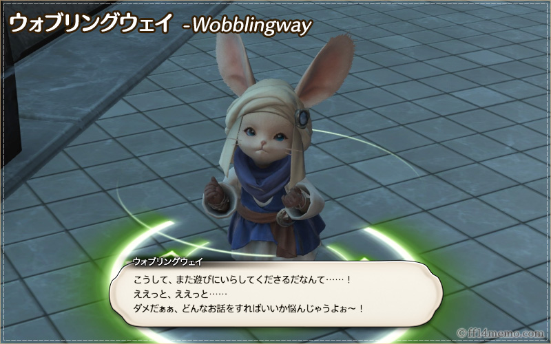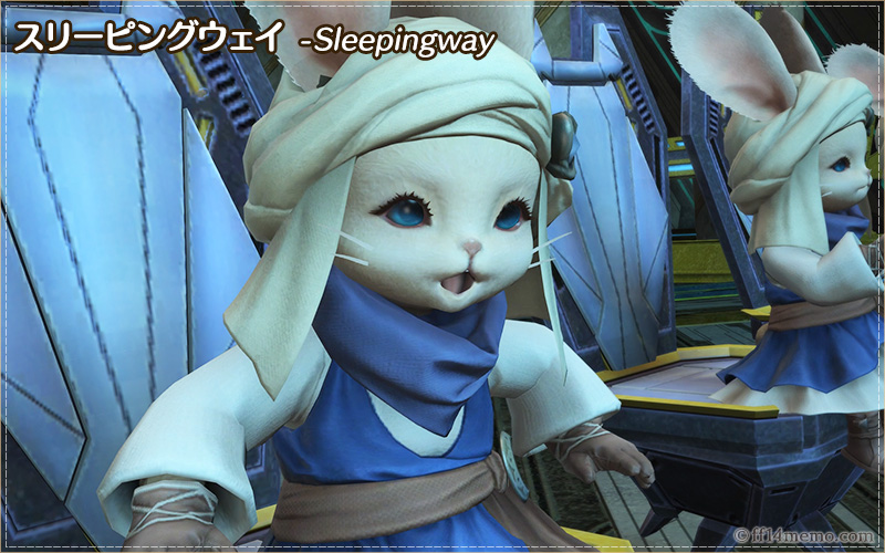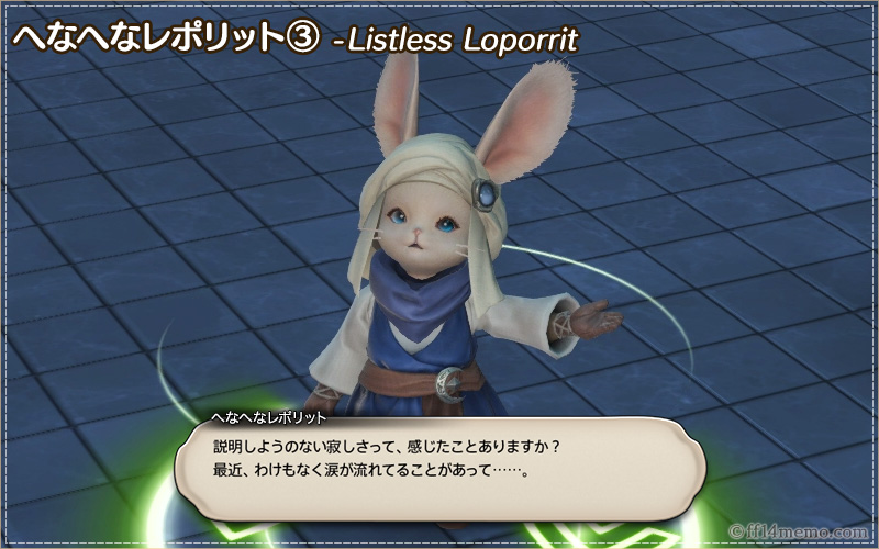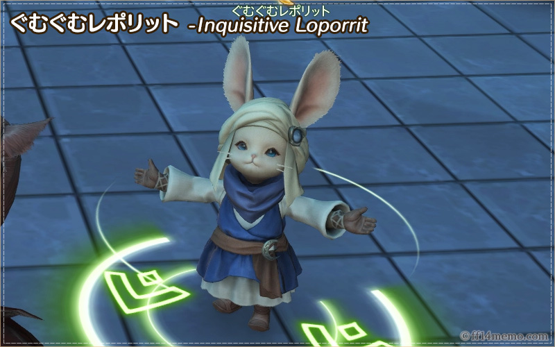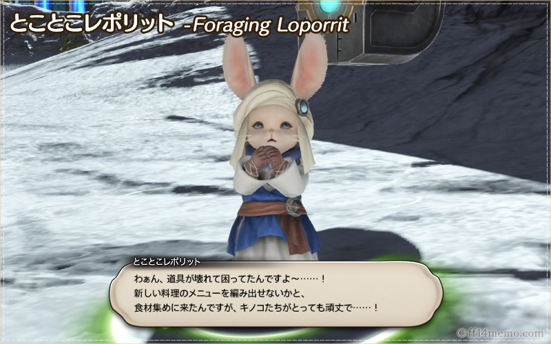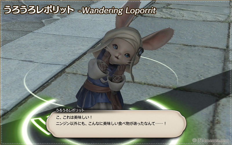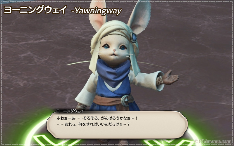 - Drowsy(眠い、眠そうな)。ドリーミング・ワークショップで作業に打ち込みすぎて疲れが溜まってしまったレポリット。ヒカセンがムーンホッパーに騎乗して「ホップステップ!」をすることで元気を取り戻します。レポリットは総じて頑張りすぎなところがありますネ。