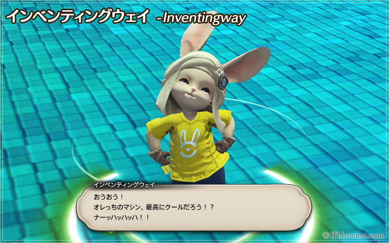 - 友好部族クエストで関わるキャラクター。マシンの修理やメンテナンスを担当しているレポリット。目標を失った仲間のために一緒に協力してほしいと勧誘してみますが、日々のメンテナンス作業で忙しく、残念ながら断られてしまいます。代わりに、と「インベンティングウェイ」を推薦してくれます。