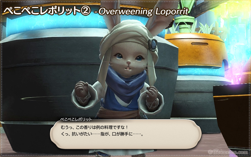 - Overweening(自負心の強い、傲慢な)。この「ぺこぺこレポリット」は「ニンジンは生こそが至上」という考えを持っていたようなのですが、ヒカセンが持ってきたニンジンステーキを前に、あっさりその考えを変えたのでした。